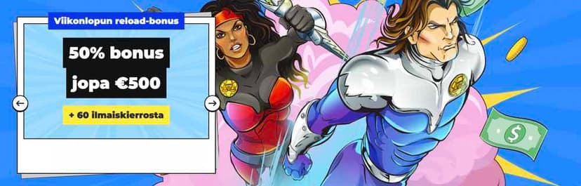 Viikonloppuisin meno vain paranee, sillä aina perjantaista sunnuntaihin voit lunastaa viikoittain yhden erikoisbonuksen. Tätä etua maksetaan 50% ja jälleen mukavasti aina 500 euroon saakka. Päälle heitetään vielä ylimääräiset 50 ilmaiskierrosta tarjousta ryydittämään. Muut ehdot ovat samat kuin aikaisemmissakin tarjouksissa.